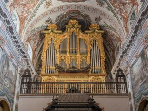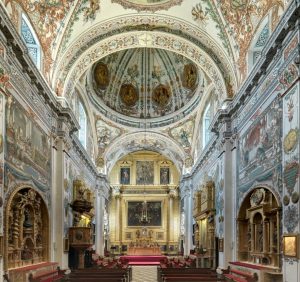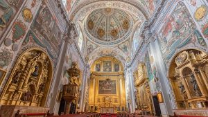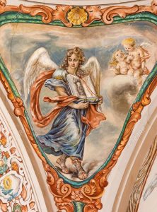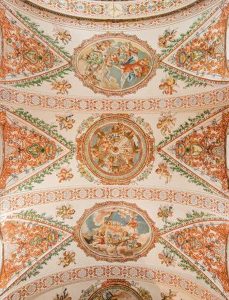 La sacristía muestra amplias cajoneras para la guarda de las ropas sagradas, y su techo esta cubierto por una de las obras mas impresionantes del recinto, la exaltación de la Cruz que se nos muestra como un juego de arquitecturas fingidas digno de admiración.
