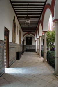 El patio central consta de galerías porticadas, colores calizos y rojizos, sembrado de naranjos y con una fuente en el centro a nivel inferior del suelo. Los azulejos que rodean el patio, con dibujos geométricos recuerdan la época andalusi de la ciudad.
